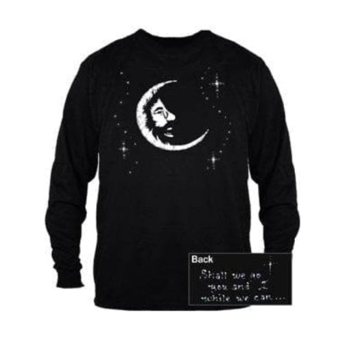 Did you know that Jerry Garcia is really the man in the moon. The Jerry moon white starlight graphic is printed on the front of this purple, 100% heavyweight preshrunk jersey cotton adult long sleeve t-shirt. Screen Printed on the back is "Shall we go, you and I while we can..." from the classic Dead song "Dark Star". A beautiful pure Jerry styled t-shirt. One of my favorites! Officially licensed by the estate of Jerry Garcia. Also available in black.