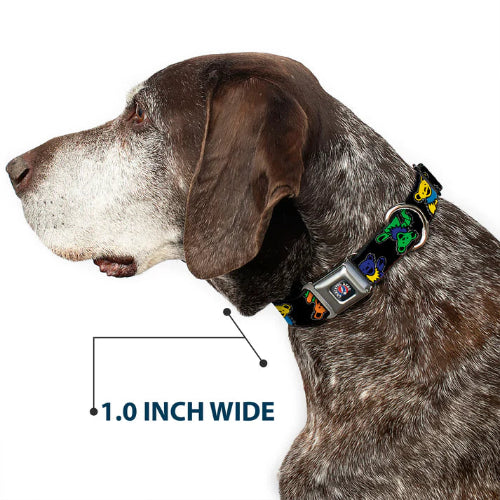 Este collar para perros Grateful Dead está hecho con una hebilla de cinturón de seguridad en miniatura que se libera convenientemente con solo presionar un botón. Es un collar negro con los osos danzantes de Grateful Dead alrededor.