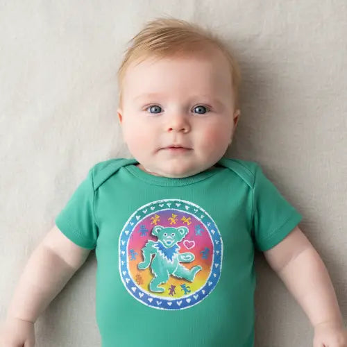 This Grateful Dead kids design features a batik style dancing bear on a tie dye background. Made of 100% ring spun interlock cotton for extra softness. Short Sleeve Snap Crotch Bodysuit with envelope neck for ease of dressing. Officially licensed Grateful Dead merchandise.