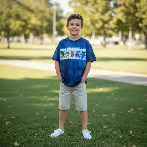 Start them out young with this kids Grateful Dead T-Shirt. All blue tie dye on 100% cotton t-shirt with a row of dancing bears going across your little ones chest. Officially licensed Grateful Dead merchandise for little deadheads.