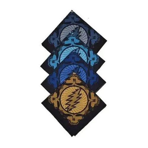 This new Grateful Dead bandana comes in 4 different color patterns and has a spinning stealie design. 100% cotton heavyweight handkerchief style bandana, measures 22" x 22" and is officially licensed Grateful Dead merchandise. Great for you or your pet.