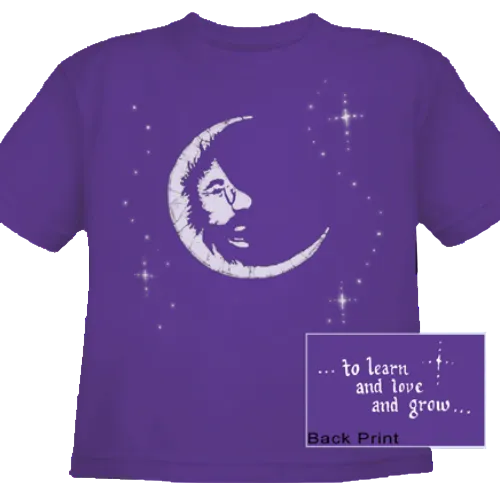 Kids version of my favorite Jerry Garcia T-Shirt. The Jerry moon white starlight graphic is printed on the front of this Navy or Purple, youth 100% cotton t-shirt. Screen printed on the back is "to learn and love and grow...". Officially licensed by the estate of Jerry Garcia.